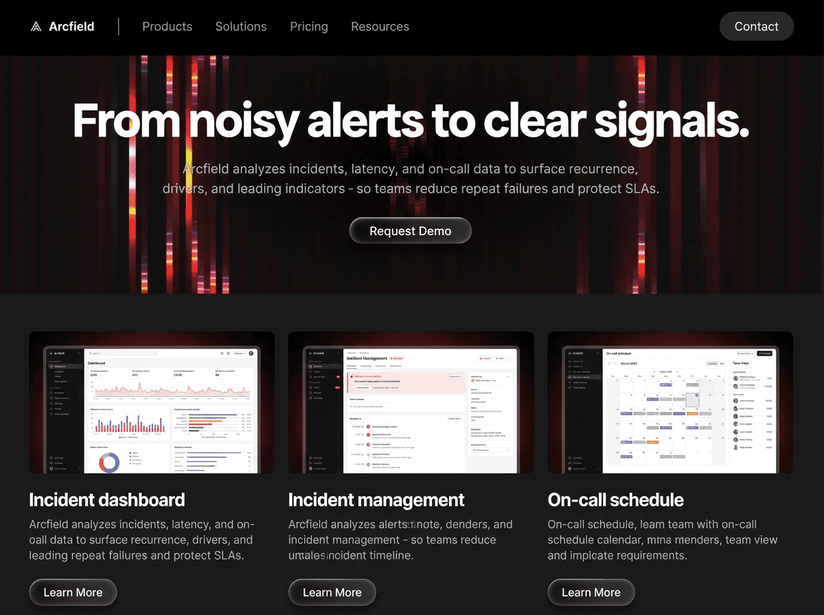 Arcfield Analytics needed a conversion-focused Framer site that explains the platform in under 30 seconds and moves ops teams toward a demo request. The scope was to define the messaging hierarchy, design a hero + product-tour flow, and build a pricing and “Request demo” funnel that feels enterprise-credible—grounded in real SRE/DevOps language (SLA risk, incident recurrence, MTTR) while staying clean, fast, and easy to scan.